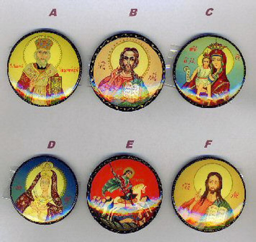 Beautiful handmade and handpainted brooches Made in Russia. Each brooch depicts a different saints. Each brooch is 2 x 2 inches ( 5 x 5 cm). Each brooch is just $ 9.95 each. If you want all 6 please specify six under qty. The saints featured in the pictures are by letters please specify which letter you would like upon purchasing. A: Winter St Nicholas