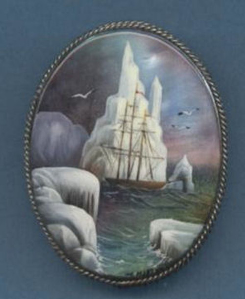Hand made brooches that reproduce different animals, scenes and subjects into mother of pearl pictures. Here we have a Ship at Sea blended with a weatherly background. These have excellent shine with the working in of beautiful mother of pearl with the item. Size 1.5 by 2 inches