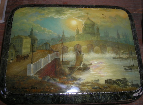 Here we have a beautiful landscape work by the very popular artist Mitusov of Fedoskino. This work is titled "OLD MOSCOW RIVER BANK". The bridge over the waterway you can see some mother of pearl effect and over the river where the boats are moving through the river. On the bottom of the box and the sides you can see that it has a marble look, but is made out of paer mache absolutely wonderful way of incorparating a wonderful painting on the top but the sides of the box are just spectacular. The box is handpainted and signed by the artist Mitusov. The size of the box is 5 x 3.75 x 1 inches ( 13.5 x 10 x 2.5 cm).Materials used to paint the box: tempera, gold 18kt, aluminium, linseed oil, and lacquer.