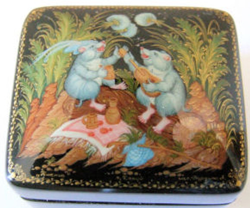 Very strange! Two mice having a party out in the sticks. Excellent detail and even through this box is small, it has great balance with the greens and light blues. The artist, Burdina of Kholui, has created an old story, including the mouse with the violin.