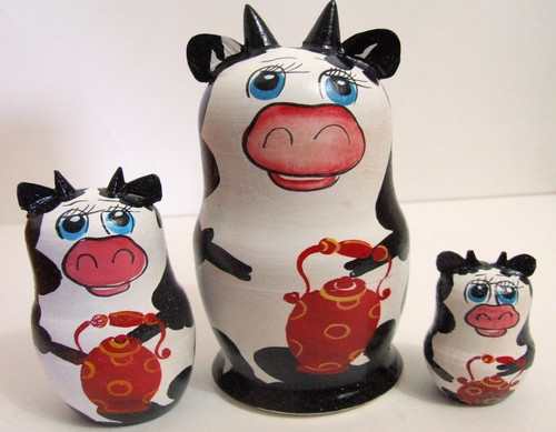 A 3pcs Russian Nesting Doll of Cows. Each doll in the set has handcarved ears on the top. Each doll is hand painted and handcarved by a talented Russian artist. Each cow throughout the set is holding a teapot.The size of the talllest