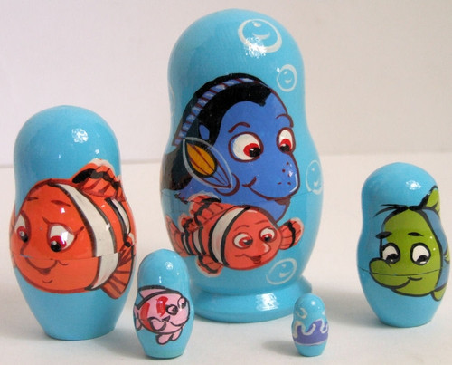 5pcs Russian Nesting Doll of the World famous Finding Nemo movie series. Featuring various characters from the movie including the one and only nemo. The set is hand painted by a talented russian artist and is made in Russia. In stock here in the US.