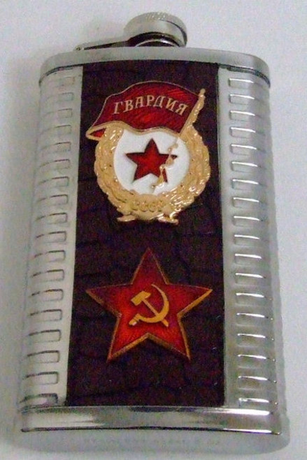 A russian military 6oz stainless steel drinking flask style 3. Ready for use. Great for ballgames or makes a great gift. The badges on the flask are: On the bottom is the red star and the top is the soviet guard emblem to protect the motherland. Made in Russia. Capacity: 6 oz Material: stainless steel.