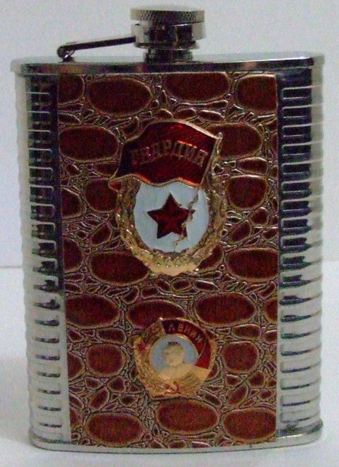 russian military 8 oz stainless steel drinking flask. Ready for use. The badges on the flask are: On the bottom is the lenin symbol and the top is the soviet guard badge to protect the motherland. Made in Russia. Capacity: 8 oz Material: stainless steel