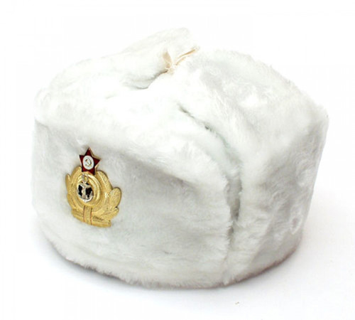 This white fur hat with ear flaps is a traditional Soviet Army winter hat - warm and cozy, perfect for protecting from Siberian winds and snow storms. It is made of faux fur which consists of man-made materials. This kind of fur has been designed during the Soviet Union specifically for such winter army hats. It is known for its durability and resistance to snow/water. It has a nice quilted lining. Each hat is supplied with a detachable anchor badge with red star. Should it be necessary, the badge easily comes off leaving no marks on the fur. They may be worn ear flaps up or down.